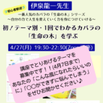 私は、伊泉先生よりこんなにも温かい世界があることを初めて教えて頂きました。だからこそ、日々不安になりがちな方には特に「優しく温かい環境がある」ことを知って欲しい思いもあって今回、直接、伊泉先生に質問ができる講座を企画しました。